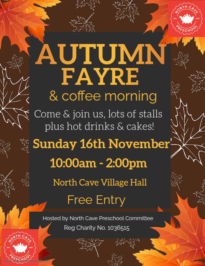 If you’re at a loose end next Sunday, pop along to North Cave Village Hall for the Preschool Autumn Fayre. There will be stalls from local businesses to get ahead with your Christmas shopping, and it will support a good cause.
